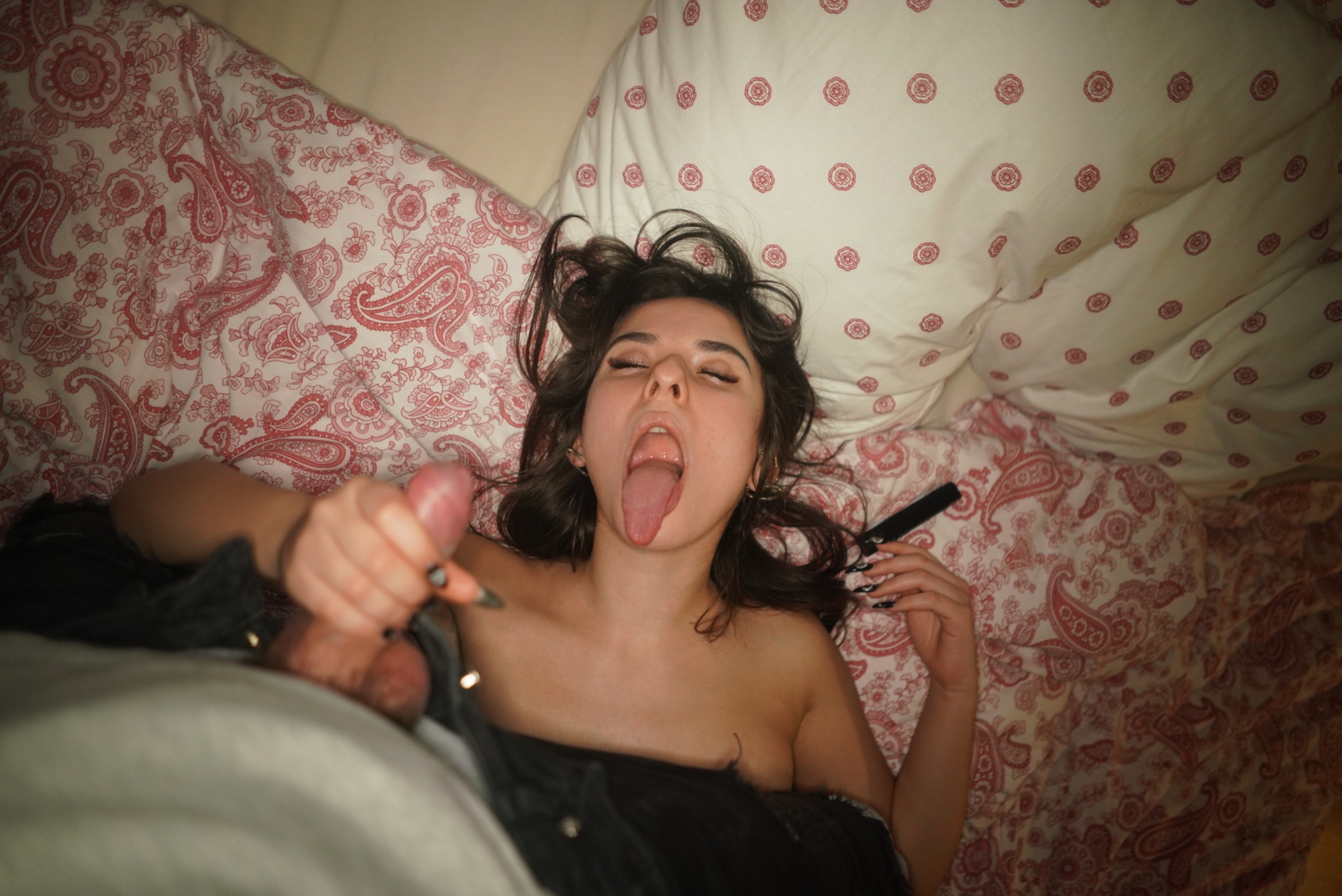 Дальше она легла на кровать и я достал член и она начала позировать с ним. Ух как я люблю эти фотки и тот процесс съёмки.